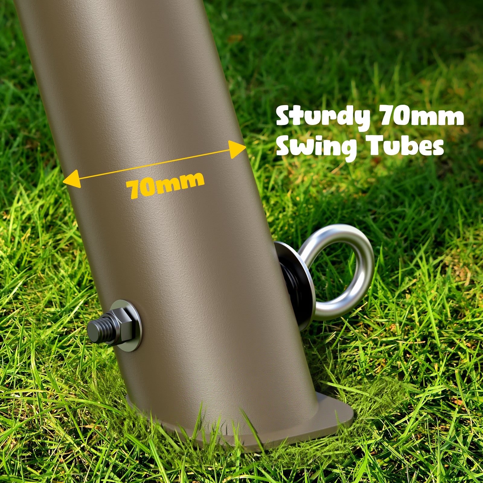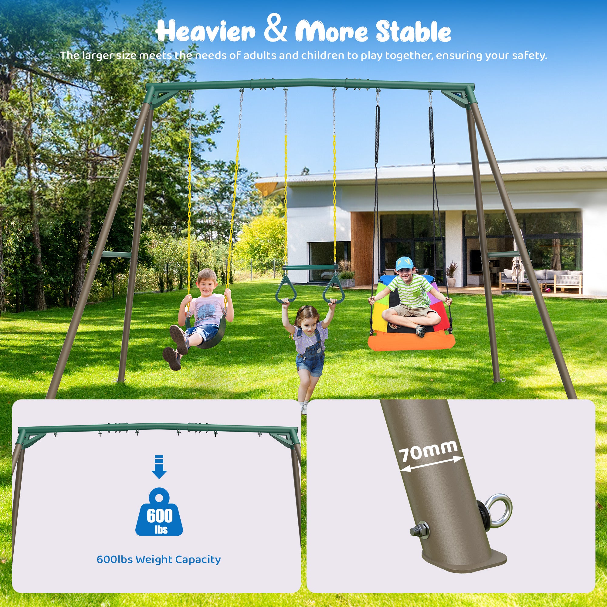 💚Heavy Duty Swing Set - The heavy duty outdoor swing set features a robust A-frame design and durable 70mm-diameter metal poles for enhanced stability. With a weight capacity of up to 660 lbs, it ensures safety and reliability for all users