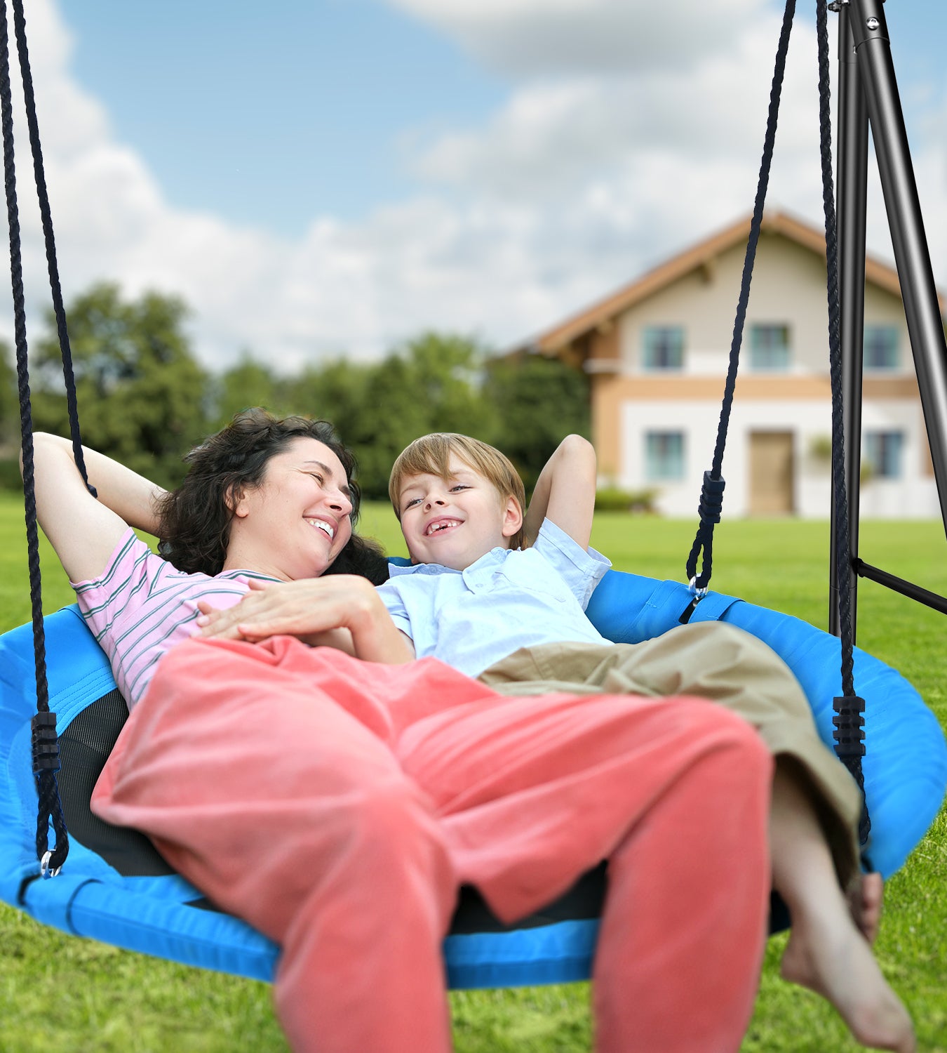 - DURABLE SAUCER SWING: 40" steel frame with high quality fabric seat, weight rated to 700 pound, adjustable high quality PE webbing hanging rope, Strong UV resistant and won't fade for years, give your swing a long life.