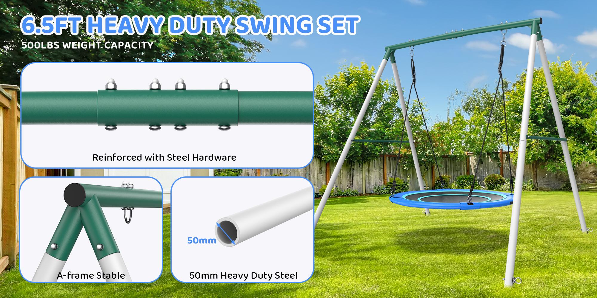 - 【Heavy Duty Swingset】 Built with robust 50mm tubing, this heavy duty 6.5ft swing set can handle up to 500 lbs. The strong stakes add extra stability, giving you peace of mind knowing your kids are safe while swinging