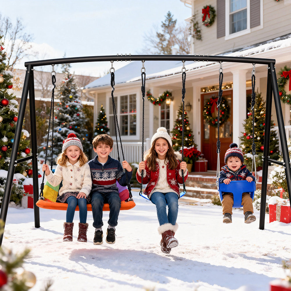 - Sturdy Swing Frame - The swing stand can support up to 440 pounds with A-Frame design. Crafted from 2-inch heavy duty weather-resistant steel tubes and hardware with powder-coated paint finish for superior durability. 3 kids can play at the same time.