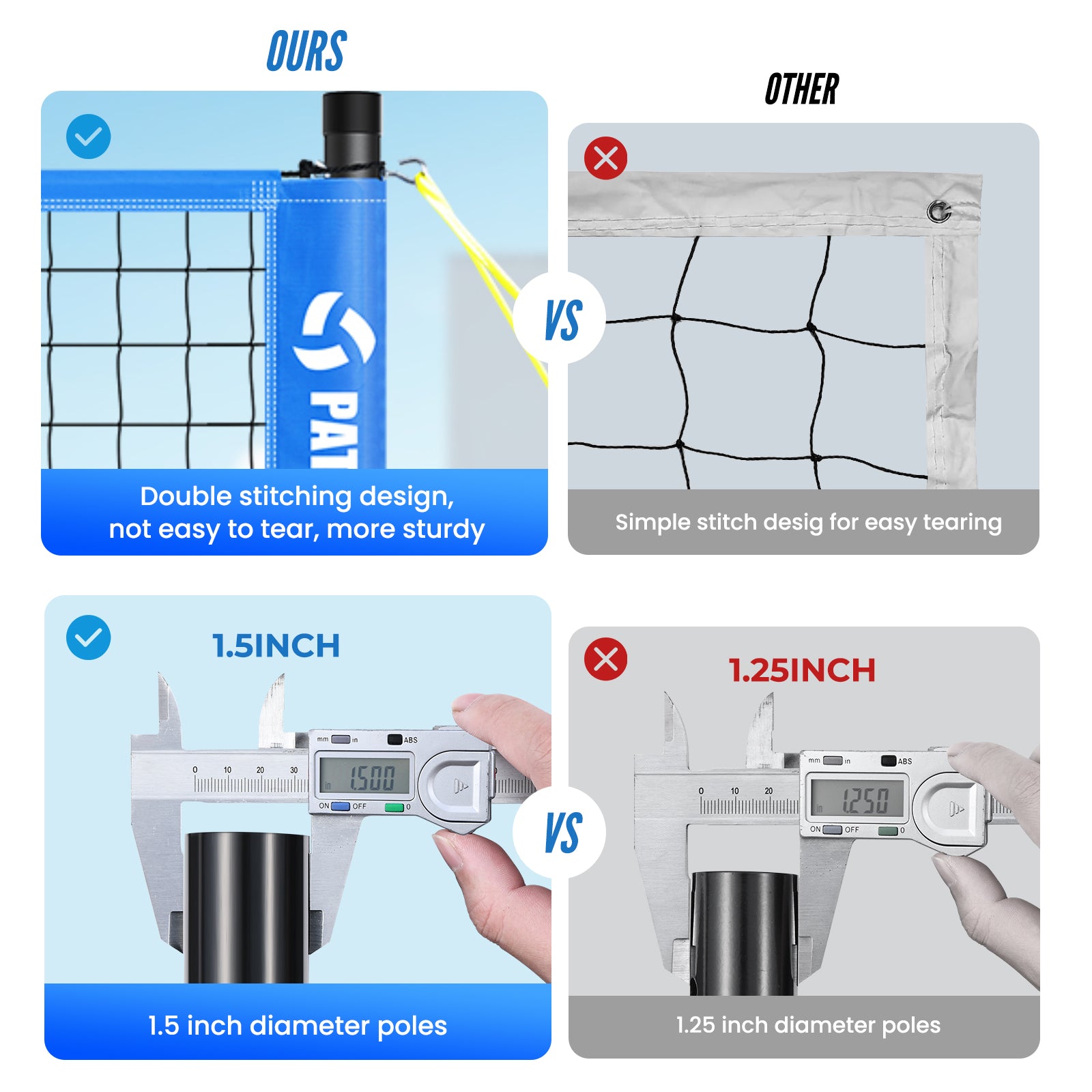 - Soft-to-Touch Volleyball: Our volleyball set also includes an 8.5" machine-stitched volleyball with a pump as well as needles to inflate it. So you could have hours of volleyball fun as soon as our set is delivered. The volleyball is covered by premium PU material, which has less impact on arms and wrists while hitting.