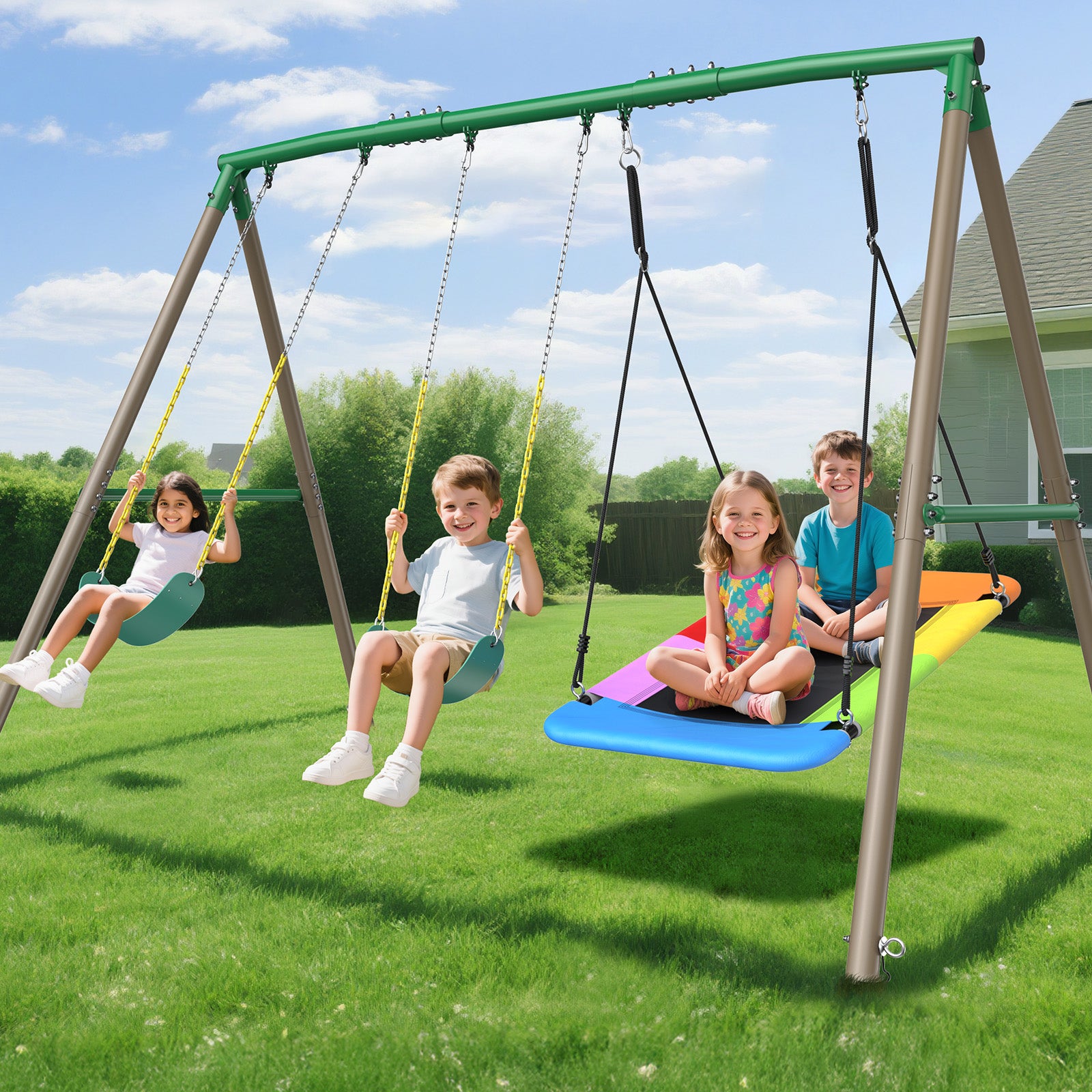 It is better to buy swing set AB0901G: https://www.autojoy.com/collections/swing-set/products/600lb-metal-swing-set-with-saucer-swing-and-belt-swings